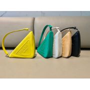 這款三角形包采用進口小牛皮.手感非常柔軟設計為雙面款式可用,壹面浮雕logo,壹面為金屬三角標,最愛的是這條肩帶可調長短,三角形設計容量空間大又輕便又實用,太完美了趕緊入手吧